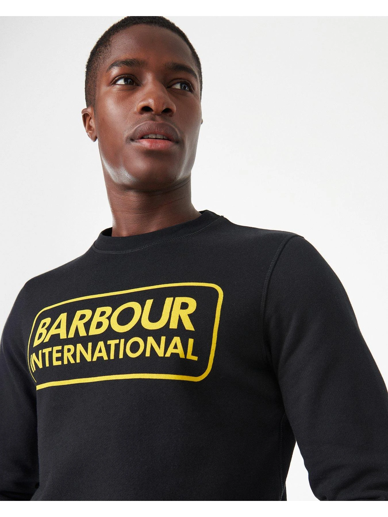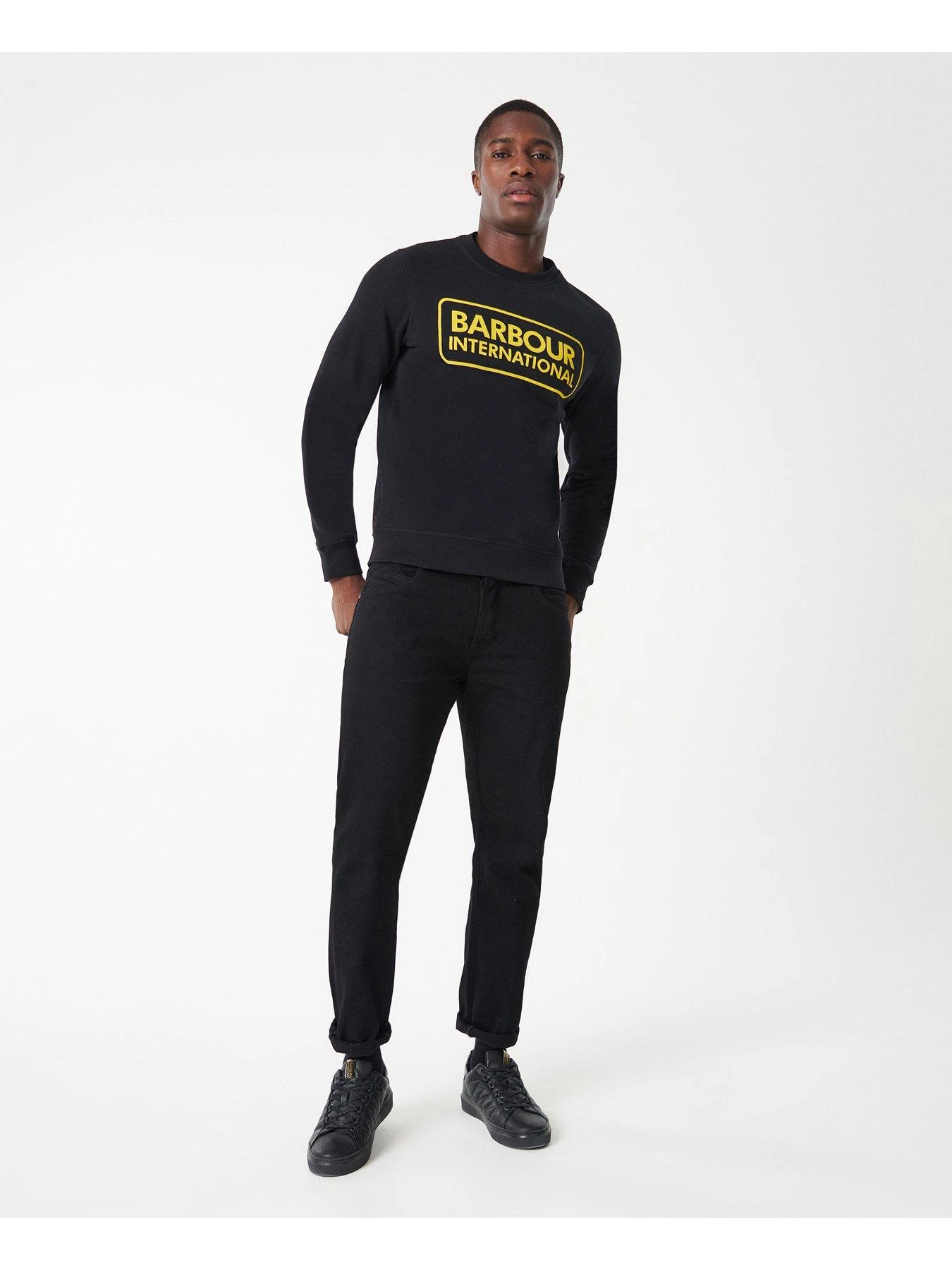 - Barbour International continues to expand its range of wardrobe essentials with this black piece. The pullover is a crew neck for versatile wearing and features the Barbour International logo to the chest in contrasting yellow. Peached fabric gives this staple a luxury hand-feel.