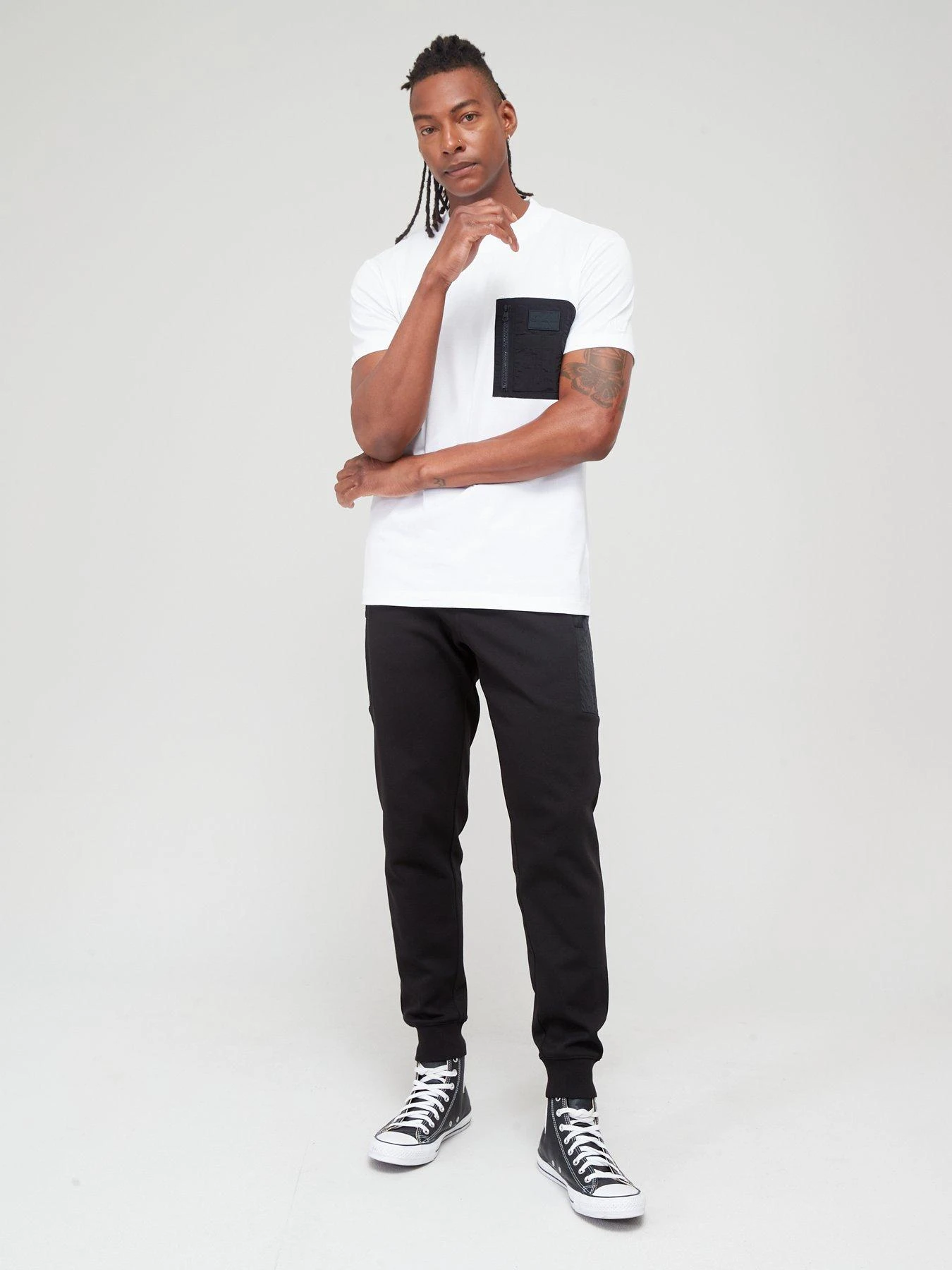 - Contrasting fabric patch to the chest features a small zip pocket