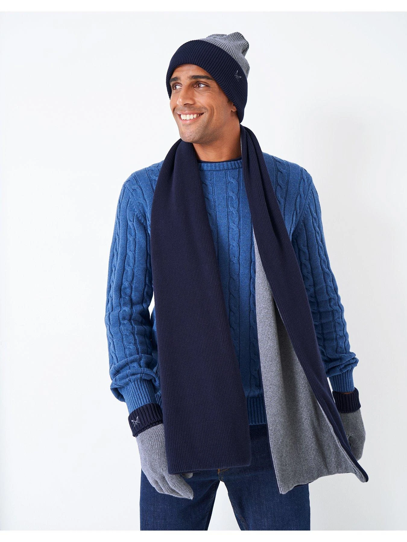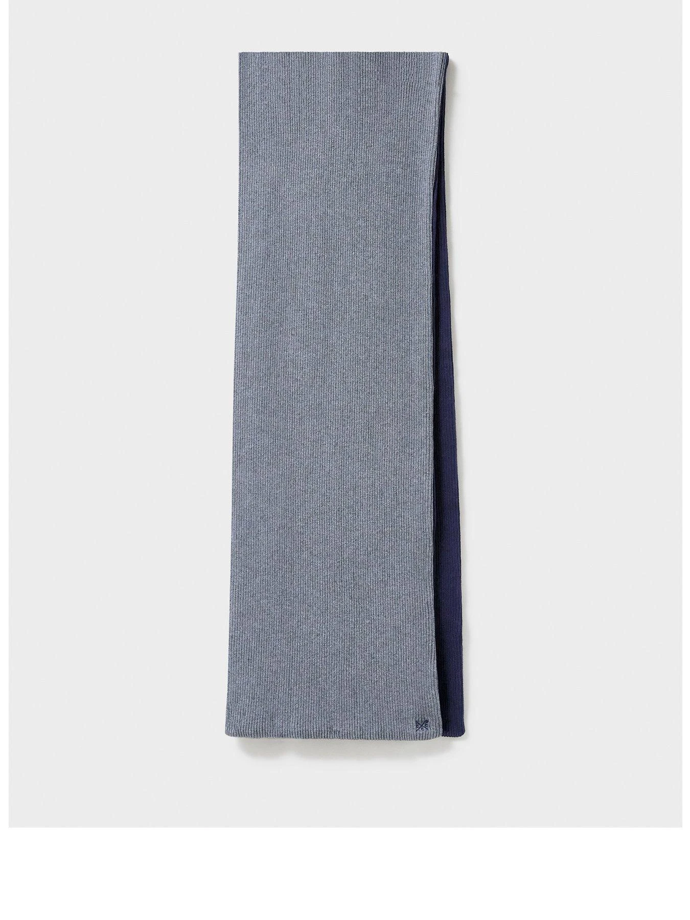 A cotton scarf in grey and navy. Featuring super cosy ribbed detailing and our crossed oars embroidery. Layer over your favourite winter coats and keep warm.