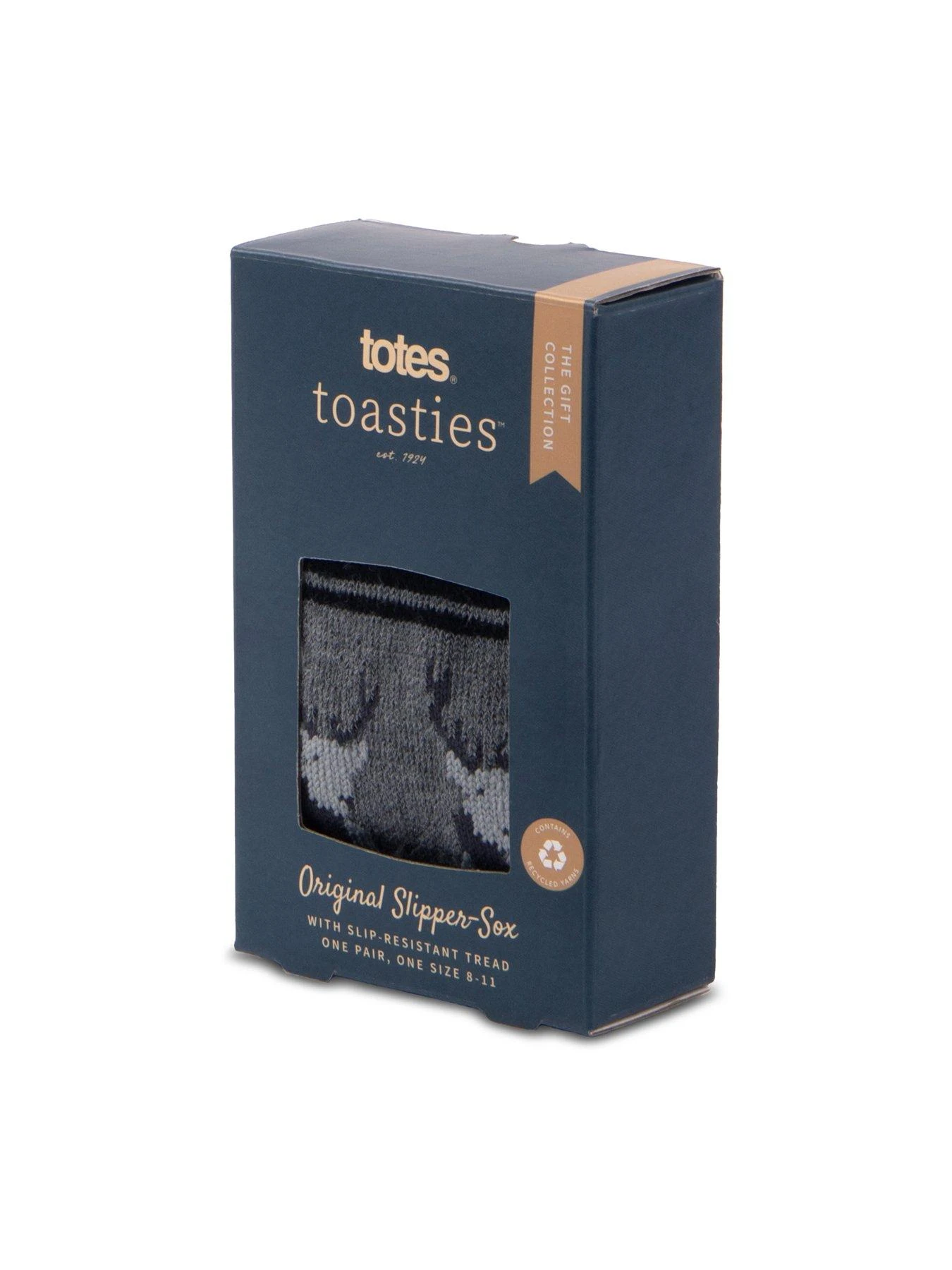 A novelty stag design decorates these totes toasties Originals slipper socks in a single pack. With slip-resistant tread, of course. Contains recycled yarns. One size fits most. Beautifully packaged for the perfect gift.